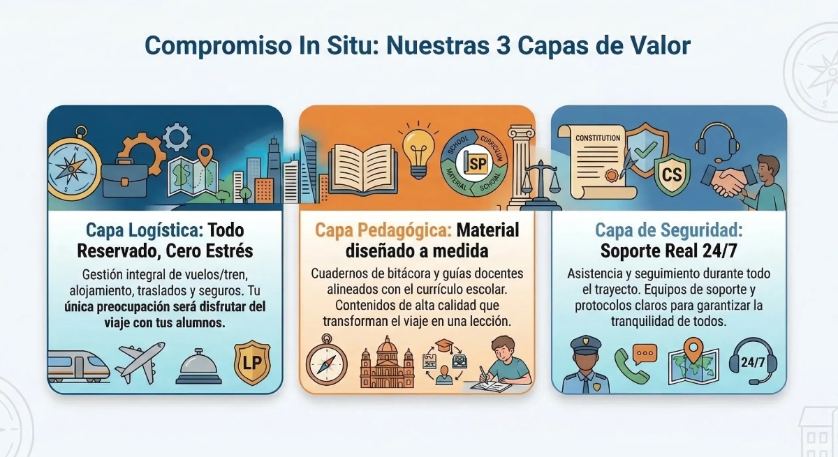 Garantizamos un viaje con un propósito educativo real, no solo turismo. Aseguramos una experiencia de inmersión donde cada actividad está pensada para el crecimiento académico y personal de sus hijos.